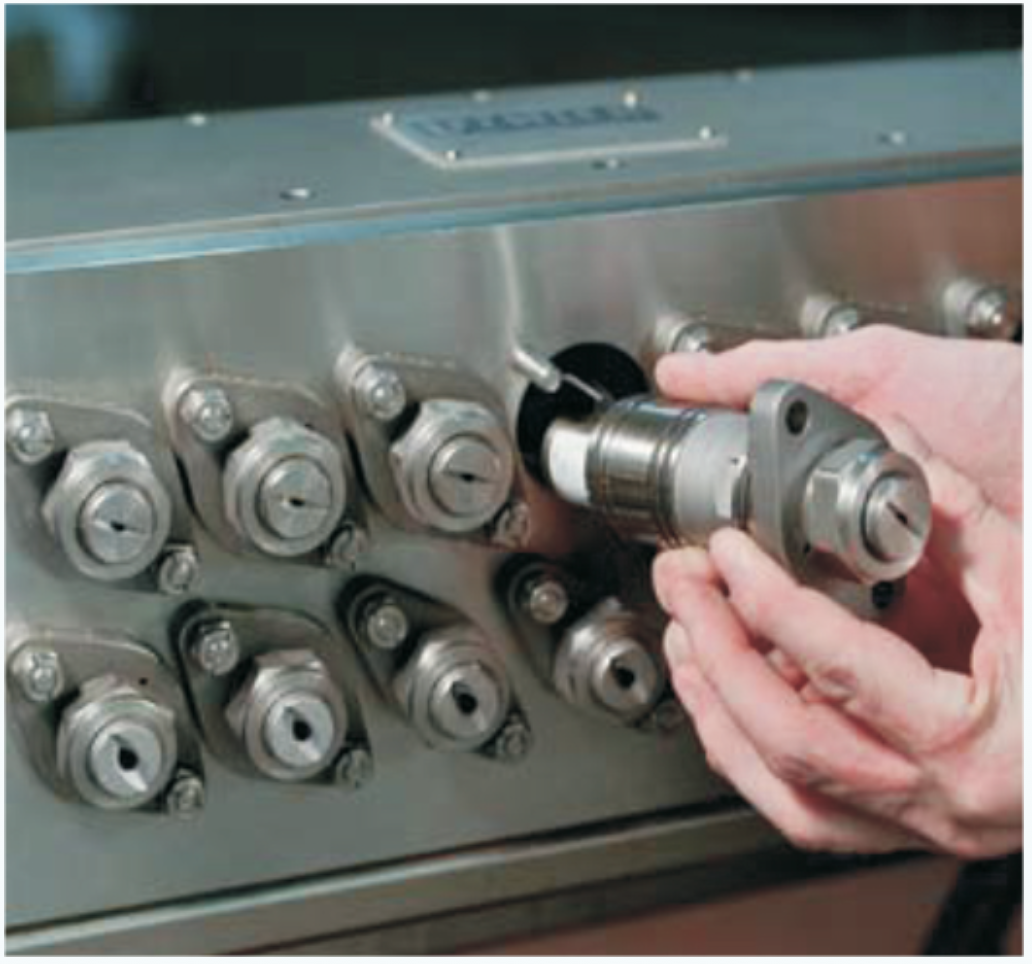 DSA 阀的设计和Modulax 阀的设计完全 一样,阀体可以互换。它们的区别是喷射梁中 的DAS阀每个阀后面直接带一个电磁阀.先导 压缩空气气通过单管直接连接到喷射梁上,当 电磁阀被启开时,压缩空气直接作用于DSA阀 上。电磁阀的寿命高达两亿周次以上,完全满 足工业化使用。